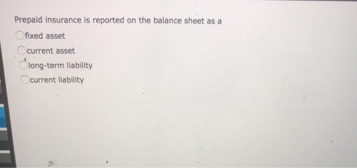 Prepaid Insurance Is Reported On The Balance Sheet As A : Solved: Prepaid Insurance Is Reported On The Balance Sheet... | Chegg.com. Entry at the time of cash payment: The advance payment is recorded on the balance sheet as a current asset. Insurance is not the only expense that must be accounted for over multiple reporting periods. Prepaid insurance premium of rs 1,000 means that the payment of rs 1,000 is made in advance for the next accounting period. Ne i d d ne d b.